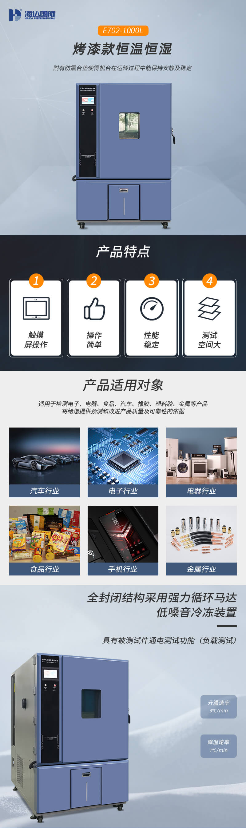 大型恒溫恒濕試驗箱主要用于模擬電子儀器儀表、新型材料、電工、車輛、金屬、電子產(chǎn)品、航空航天材料等在運輸、儲存、使用過程中可能會遇到的嚴酷高溫、低溫或濕熱環(huán)境;或高溫、低溫、濕熱交變環(huán)境下,檢驗材料、配件或儀器設(shè)備耐高溫、耐寒、耐濕熱性能及可能造成的損壞壽命縮減等。