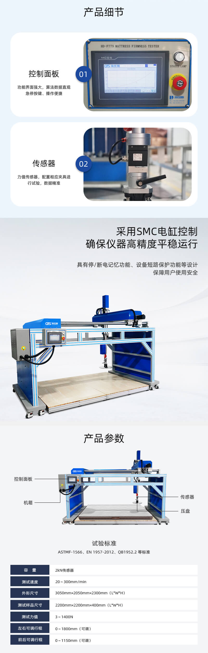 床墊軟硬度試驗(yàn)儀適用于不同床墊的軟硬度測(cè)試,在床墊不同位置加載一定載荷,比較不同床墊的加載曲線線性及相同加載點(diǎn)的力值偏差,從而判定床墊軟硬度及硬度等級(jí),提高產(chǎn)品的品質(zhì)。