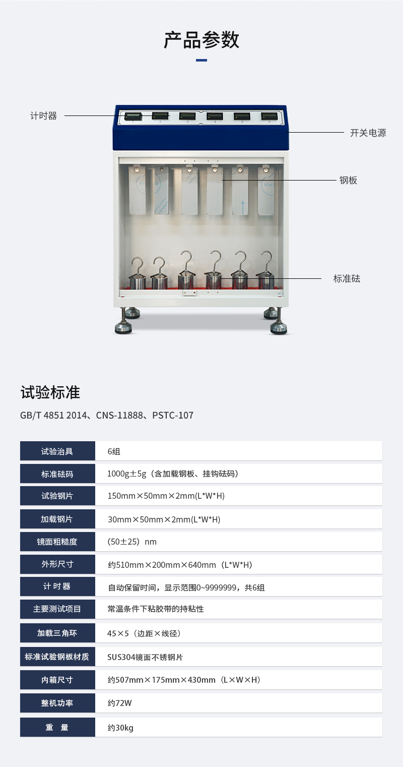 該儀器測試方法是將膠帶粘于測試鋼片上,下端懸掛標準荷重,經(jīng)過一段時間后,測量膠帶下滑距離或膠帶粘著時間用來評定膠帶粘著的持久性。