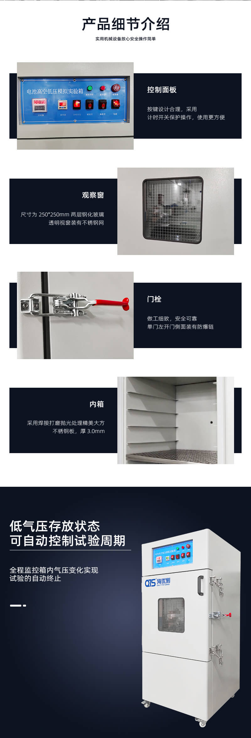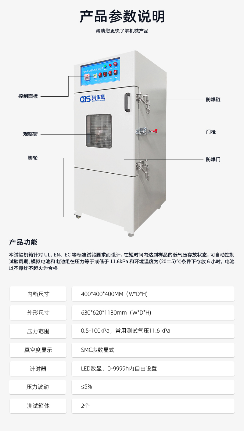 電池高空低壓模擬試驗箱針對UL、EN、IEC等標(biāo)準(zhǔn)試驗而設(shè)計,在短時間內(nèi)達(dá)到樣品的低氣壓存放狀態(tài),可自動控制試驗周期,全程監(jiān)控箱內(nèi)氣壓變化,實現(xiàn)試驗的自動終止。模擬電池和電池組在壓力等于或低于11.6kPa和環(huán)境溫度為(20±5)℃條件下存放6小時,電池以不爆炸不起火為合格。