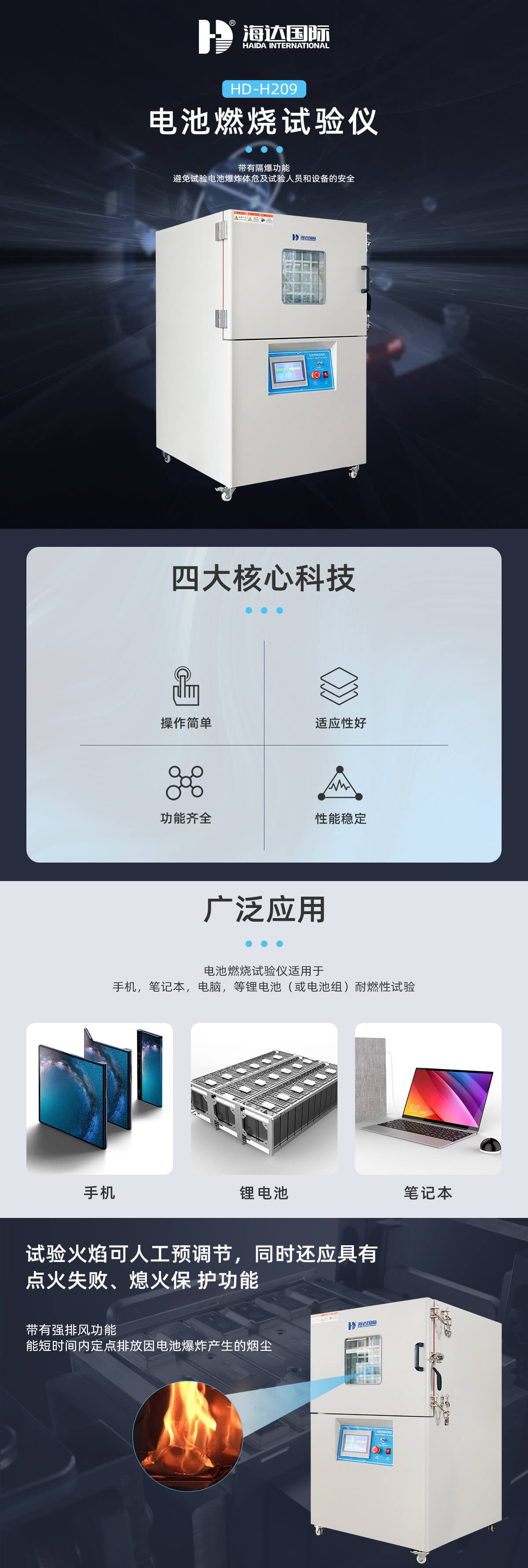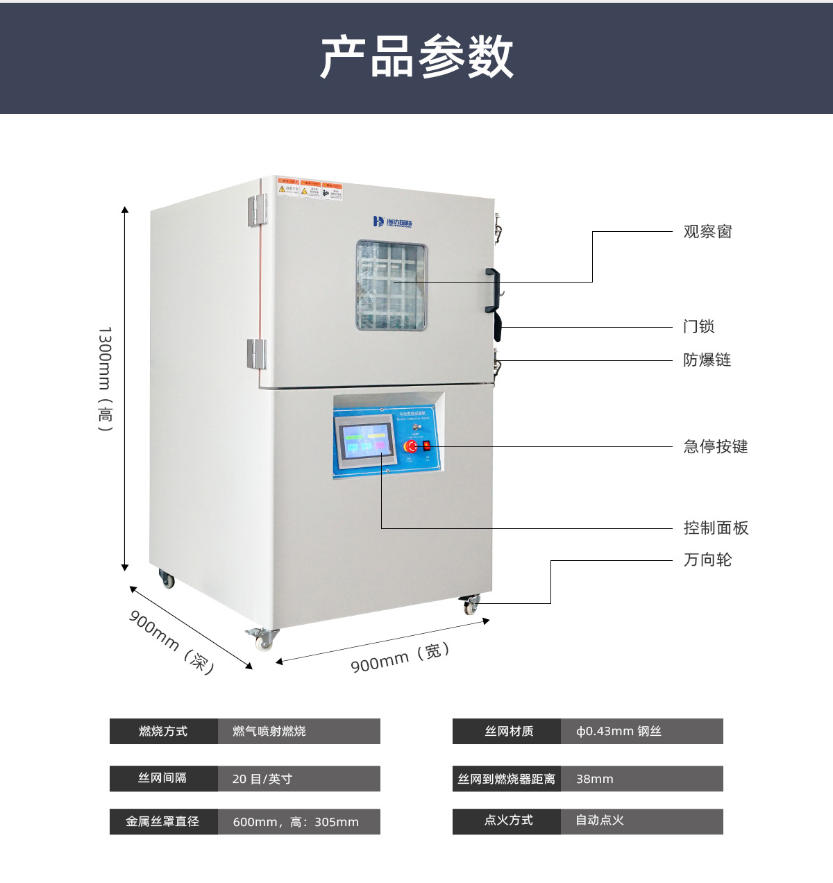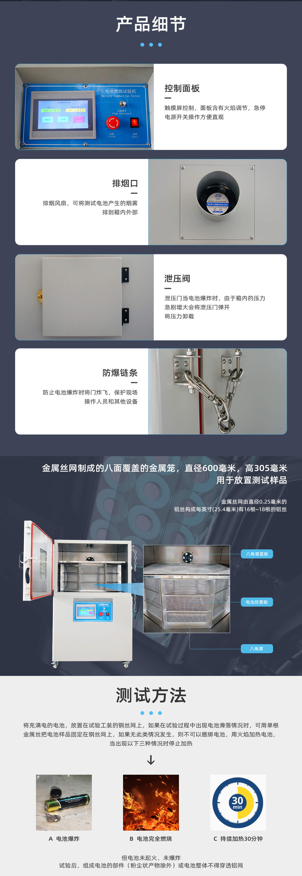 本機(jī)適用于鋰電池(或電池組)耐燃性試驗(yàn)。在一實(shí)驗(yàn)平臺(tái)上鉆一直徑為102mm的圓孔,并在圓孔上放置一鋼絲網(wǎng),將被測(cè)電池置于鋼絲網(wǎng)篩上,在試樣周圍安裝一個(gè)八角形的鋁絲網(wǎng),然后點(diǎn)燃燃燒器,對(duì)試樣進(jìn)行加熱直至電池爆炸或電池?zé)龤橹梗?duì)燃燒過程進(jìn)行計(jì)時(shí)。